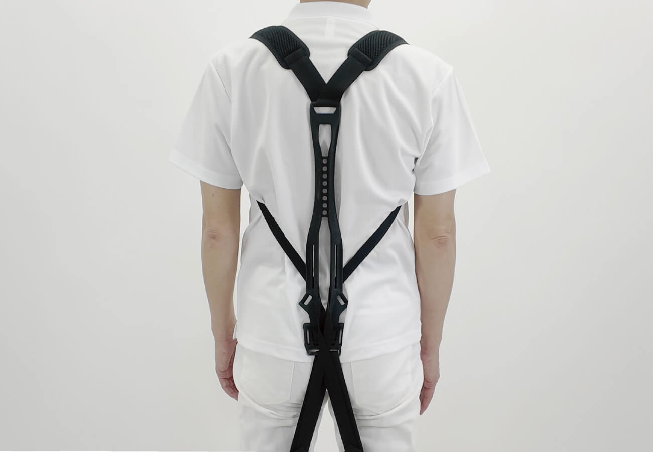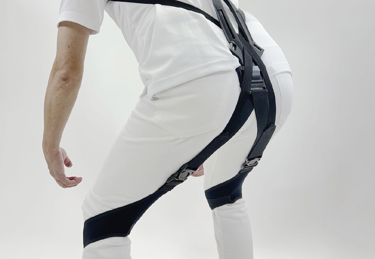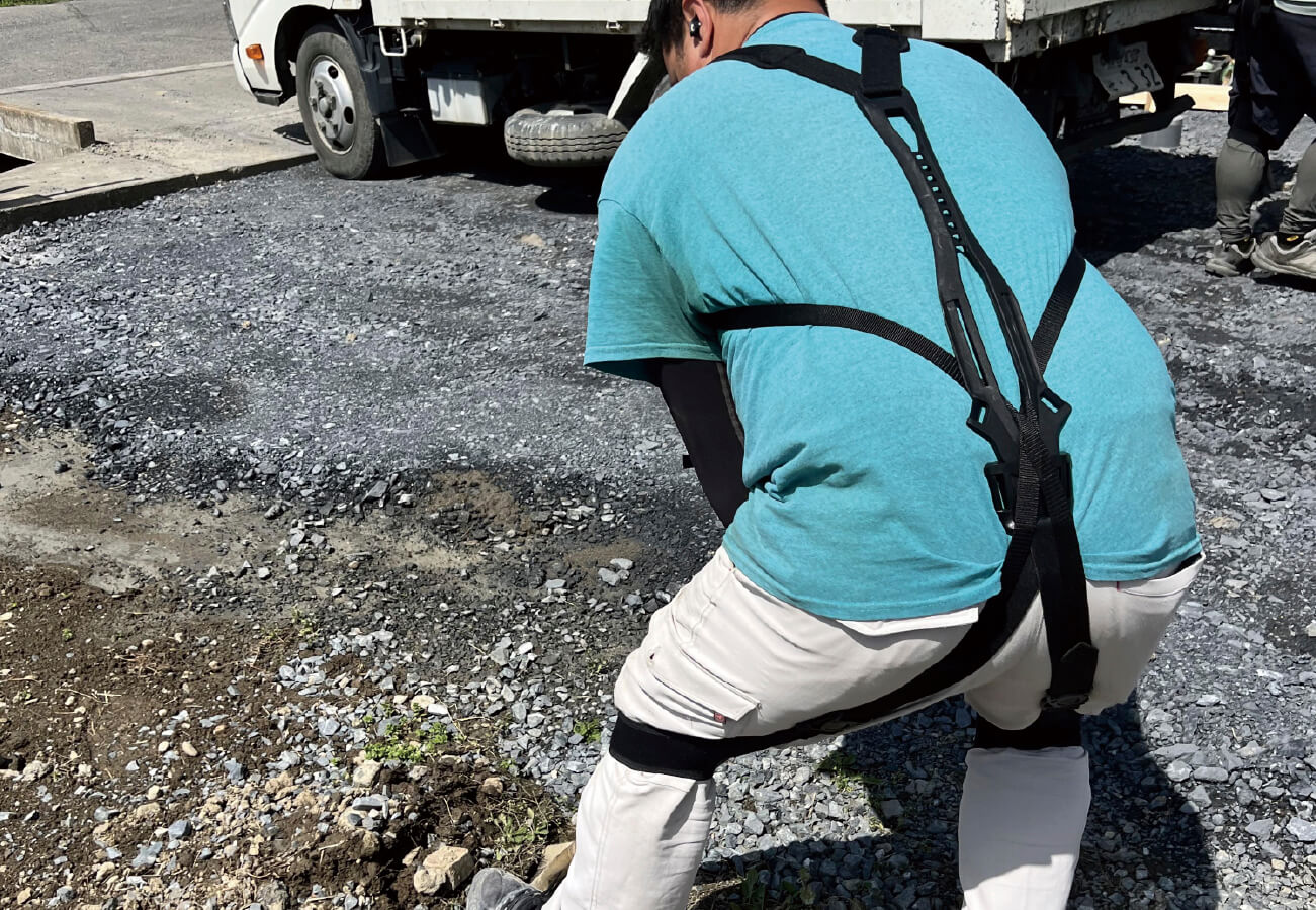 ひざから腰にかけて、脚の筋肉補助を目的としたマッスルベルトを装着。装着することで作業時における前屈姿勢や起き上がりの力を補助し、筋肉の負担を軽減します。