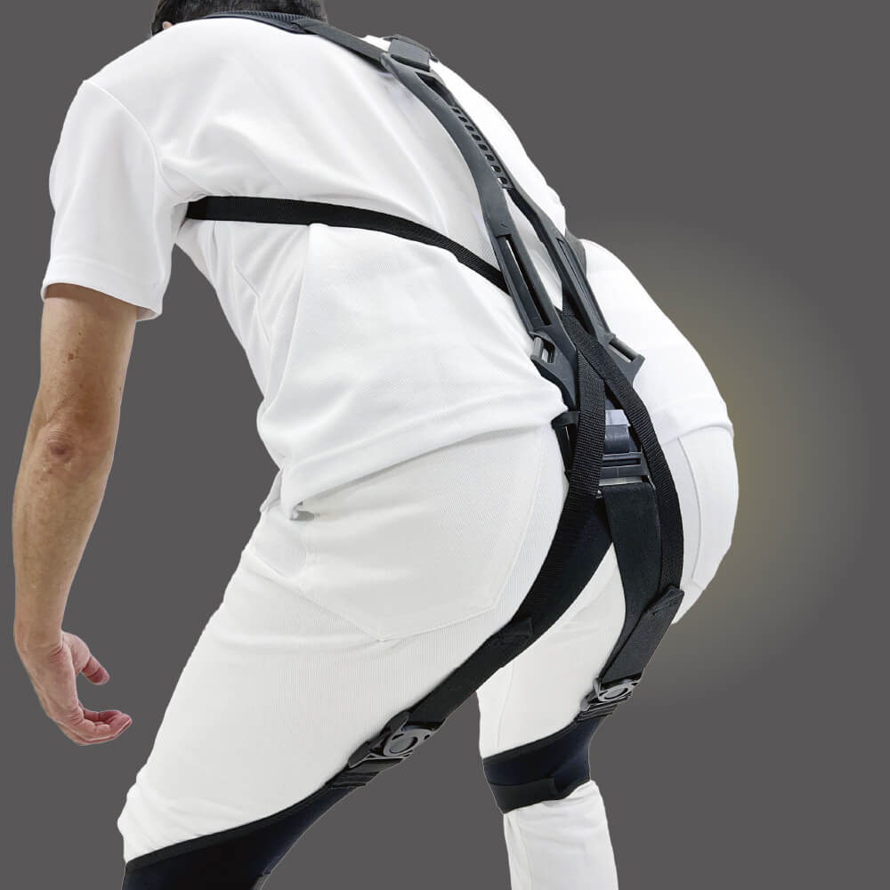 ひざから腰にかけて、脚の筋肉補助を目的としたマッスルベルトを装着。装着することで作業時における前屈姿勢や起き上がりの力を補助し、筋肉の負担を軽減します。